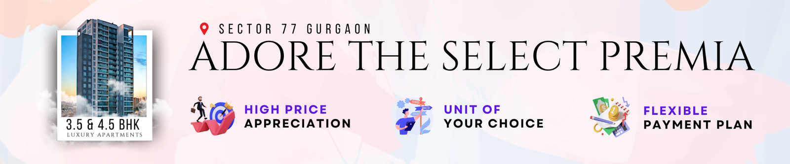 Experience luxurious living with 3, 3.5, and 4.5 BHK apartments at Adore Select Premia, Sector 77, Gurugram. This project seamlessly blends luxury, nature, and world-class amenities, surrounded by lush green spaces and exquisite architectural designs.